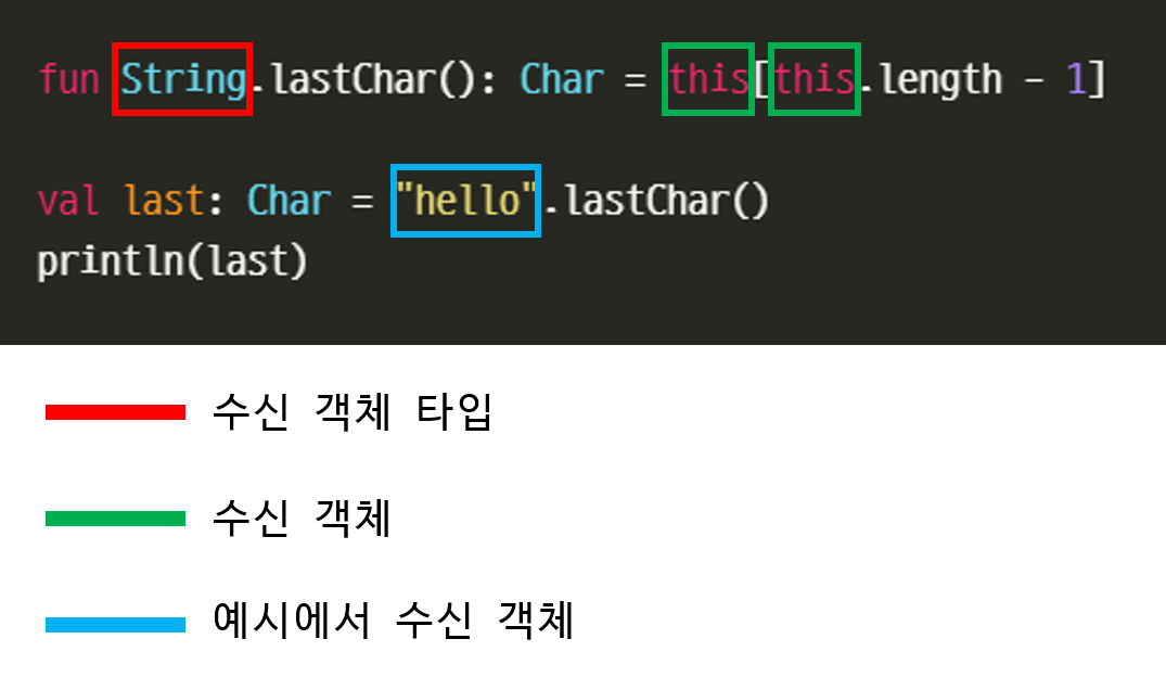 확장 함수를 사용하여 String 객체의 마지막 글자를 얻을 수 있다.